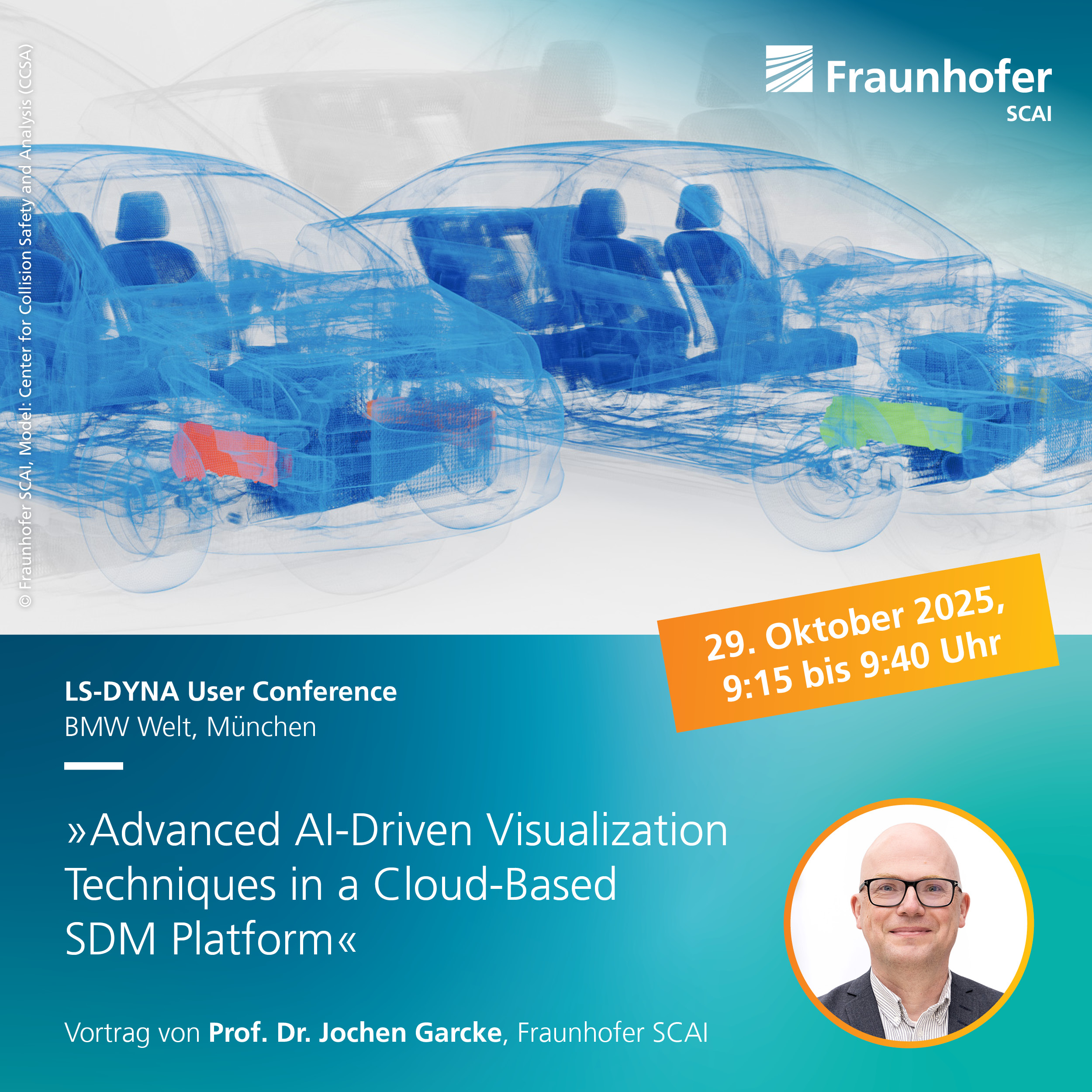 Über den aktuellen Stand berichtet Prof. Dr. Jochen Garcke, Leiter des Geschäftsfelds »Numerische datenbasierte Vorhersage« bei Fraunhofer SCAI, auf der Ansys EMEA Transportation Summit and LS-DYNA User Conference in der BMW Welt in München. Sein Vortrag »Advanced AI-Driven Visualization Techniques in a Cloud-Based SDM Platform« zeigt, wie KI-gestützte Visualisierungen neue Einblicke in die Modellentwicklung liefern.